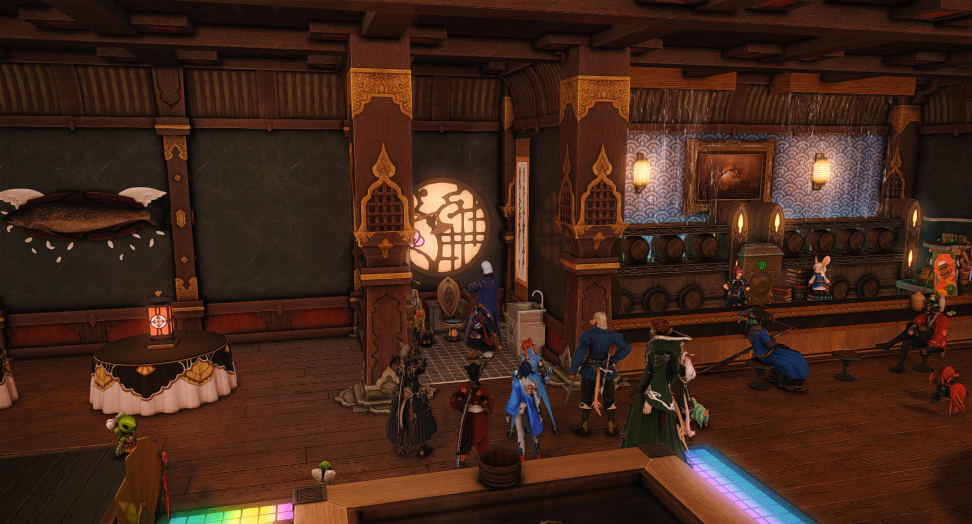NEW DIRECTIONS [#GoMaelstrom] - On the Glee House's public grand opening, the basement became a sports bar where patrons enjoyed cheering on Frontline's favorite Grand Company. Travelers from Limsa Lominsa, including an entire pirate crew, found a home away from home in Hingashi watching live sports broadcasts of their favorite team and taking in the sunny coastal atmosphere.